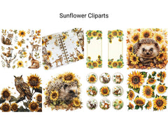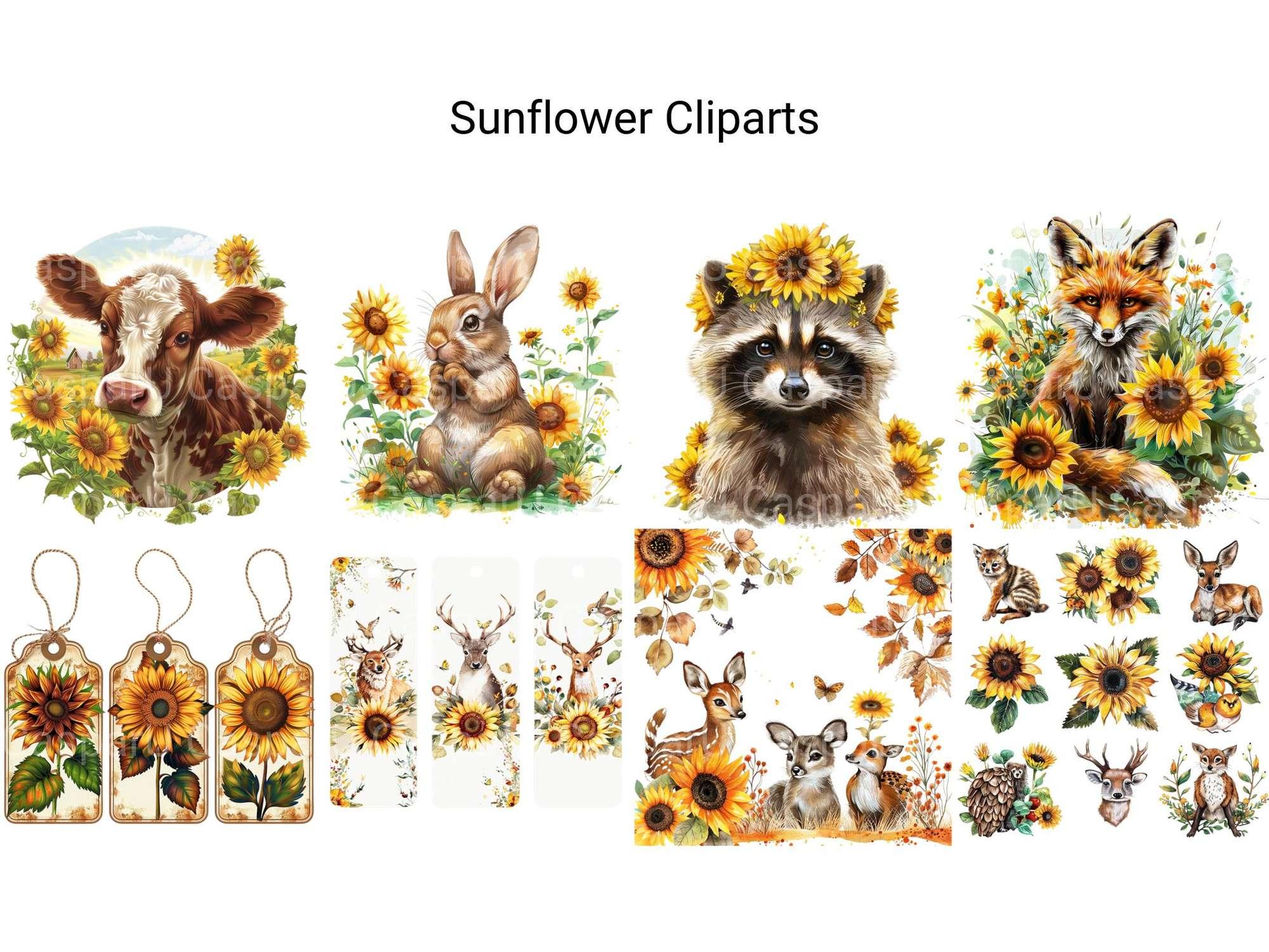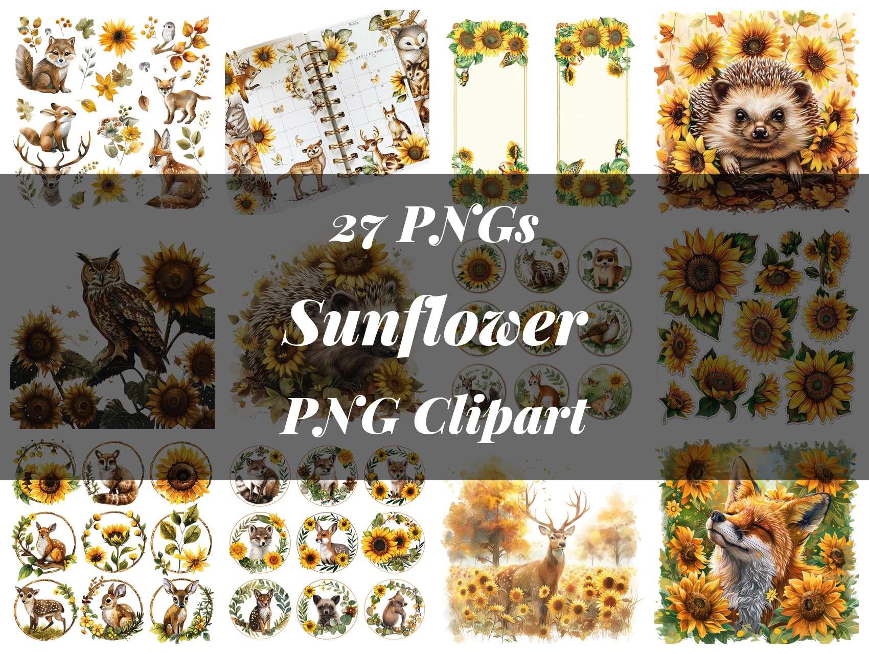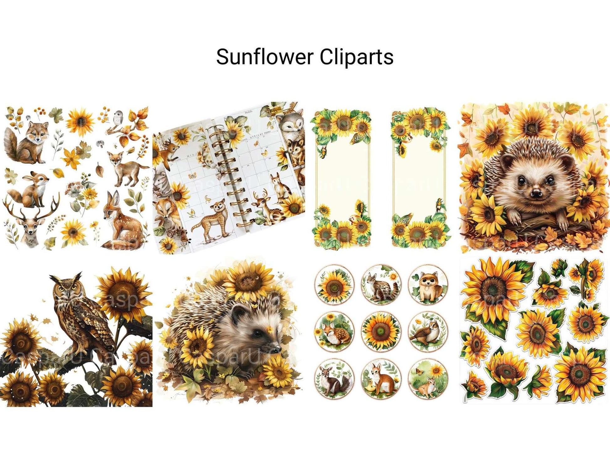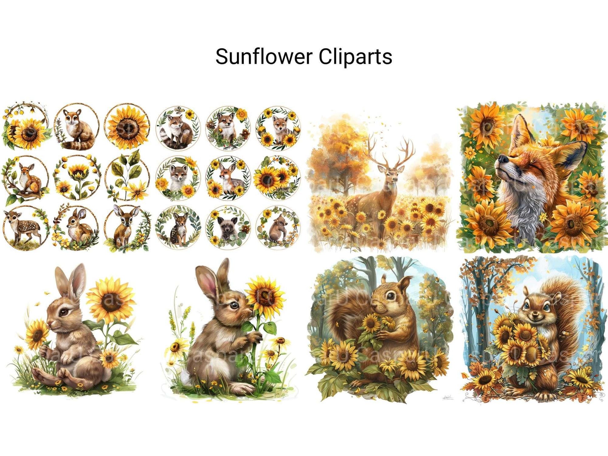 Blend nature and sunshine with this Sunflower Woodland Animals Clipart set, featuring woodland critters and sunflowers, perfect for cheerful designs.