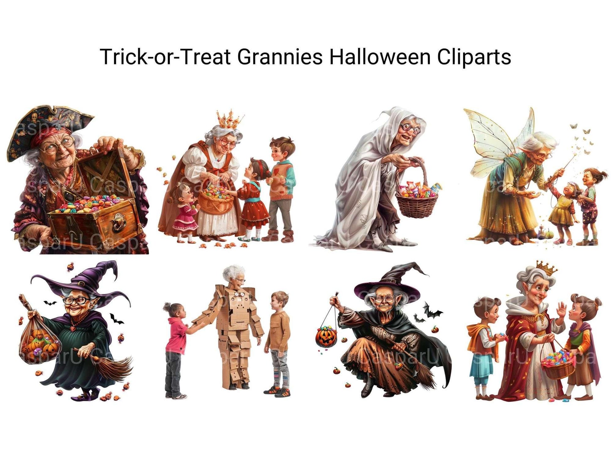 Get treats with this Trick-or-Treat Grannies Clipart set, featuring funny elderly designs, perfect for spooky fun projects.