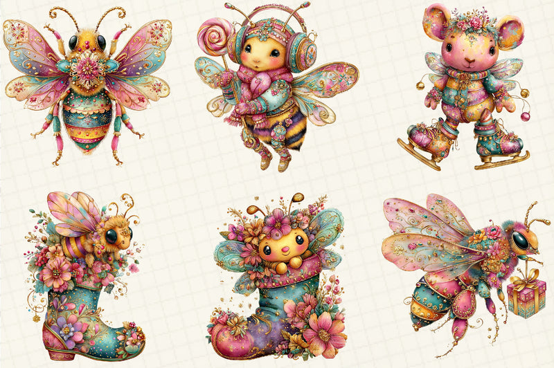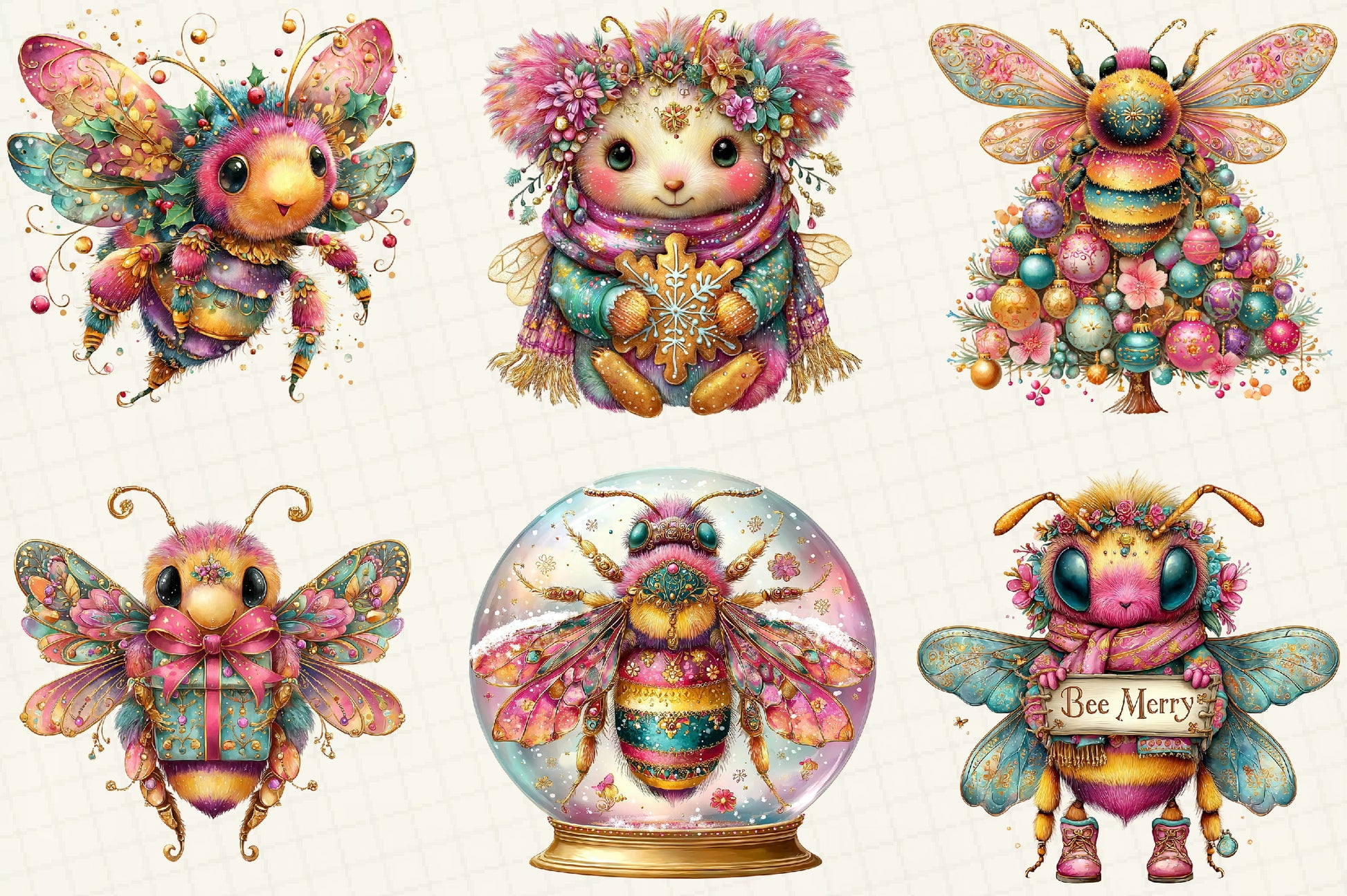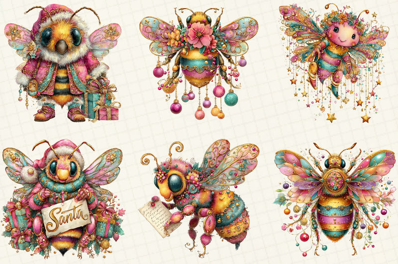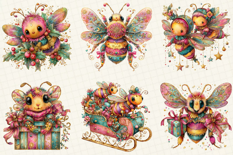 Delight in the Whimsical Christmas Bee Clipart Bundle, featuring charming bee designs perfect for festive projects. Ideal for holiday cards, scrapbooking, and creative crafts, these unique illustrations bring a buzz of joy to your seasonal creations. Capture the magic of Christmas with this enchanting collection, designed to inspire and elevate your artistic endeavors.