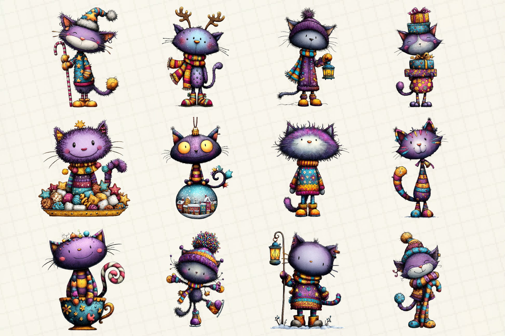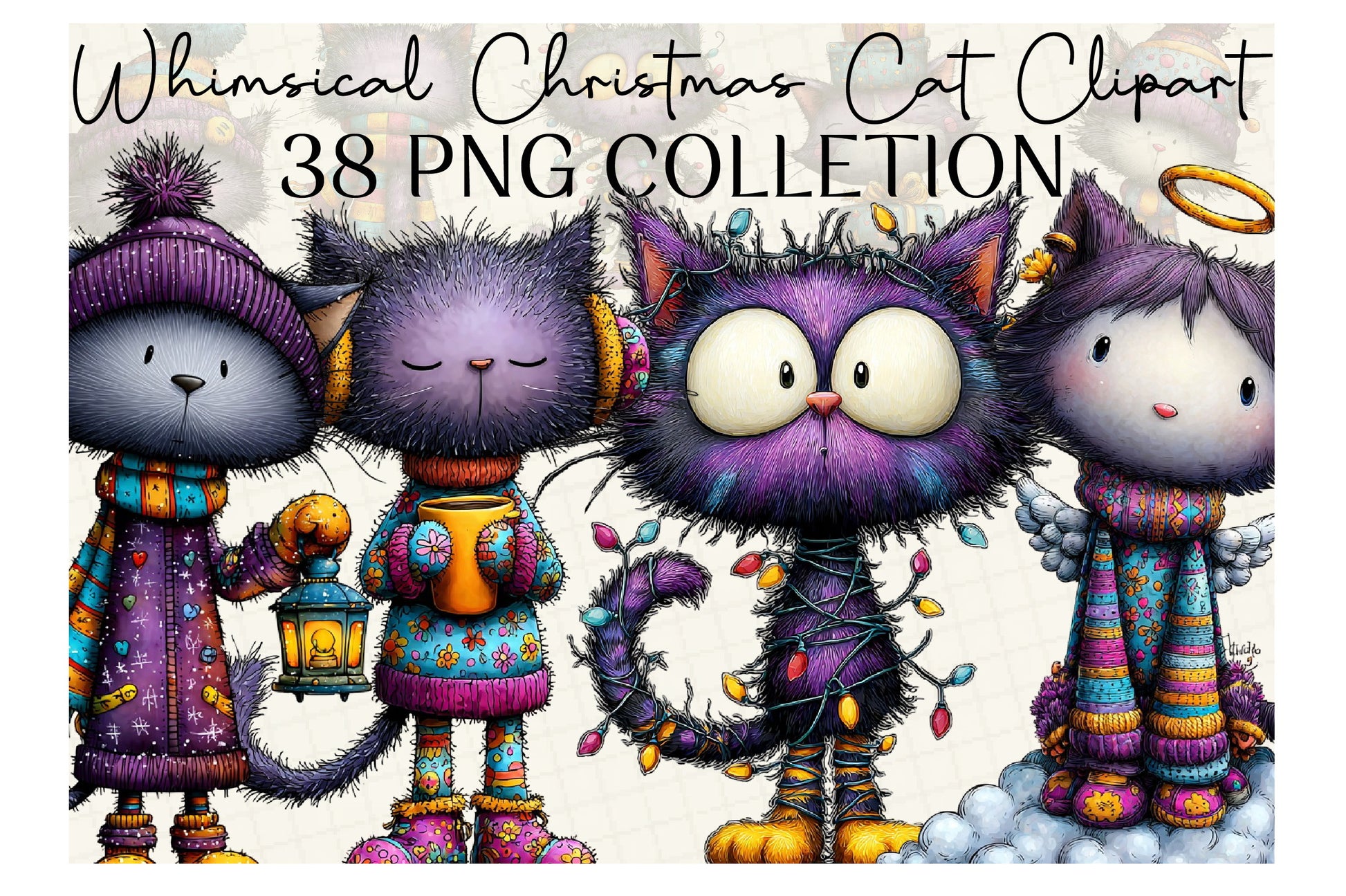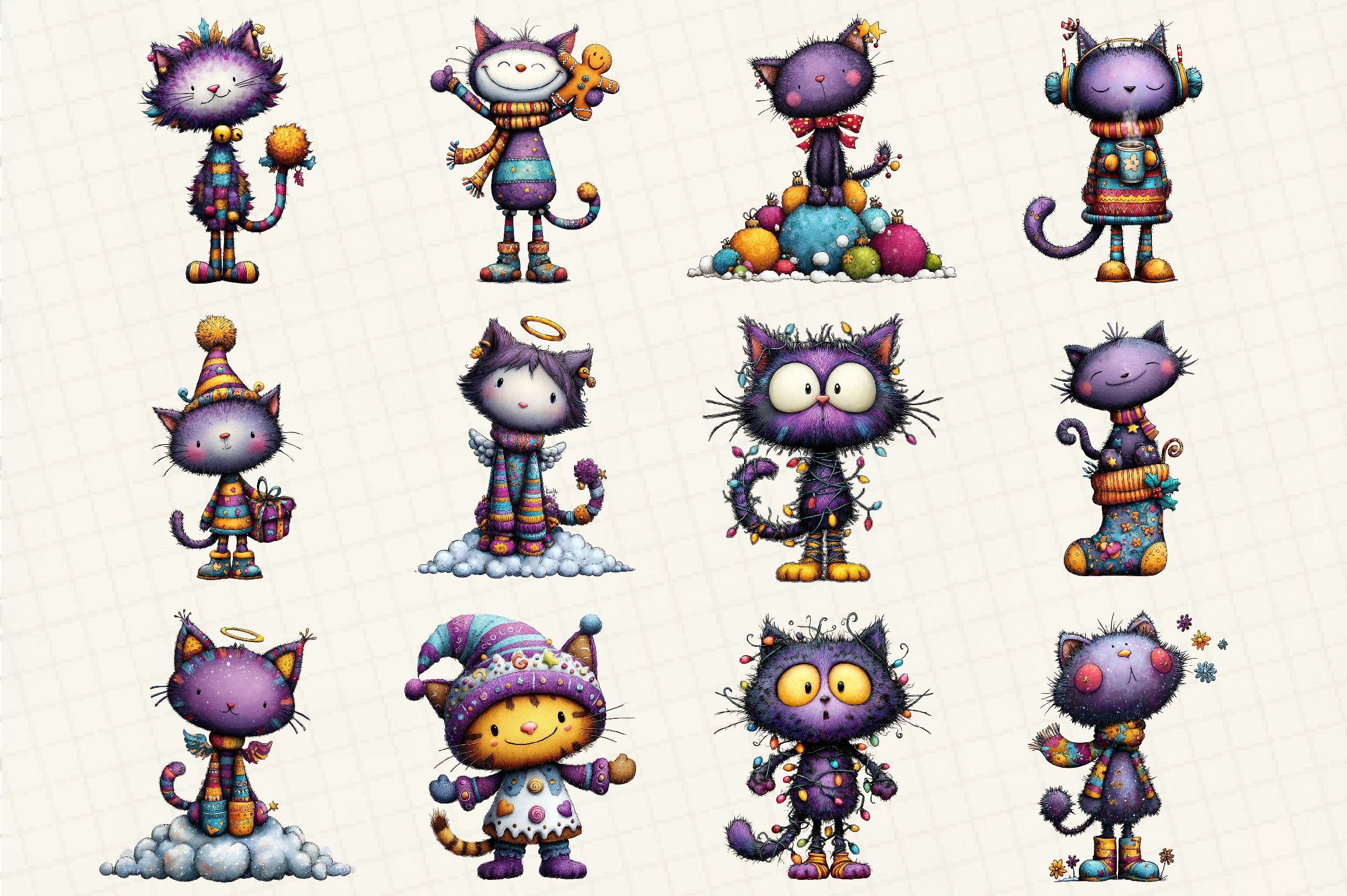 Unleash holiday charm with our Whimsical Christmas Cat Clipart Bundle, featuring delightful feline designs perfect for festive crafts and seasonal projects. Ideal for creating enchanting holiday cards, gift tags, and decorations, these adorable cat illustrations bring a touch of whimsy to your Christmas celebrations. Perfect for DIY enthusiasts and creative professionals alike, this bundle offers endless possibilities for adding a playful twist to your holiday creations. Transform your projects with these unique and charming cat cliparts, designed to spread joy and festive cheer.