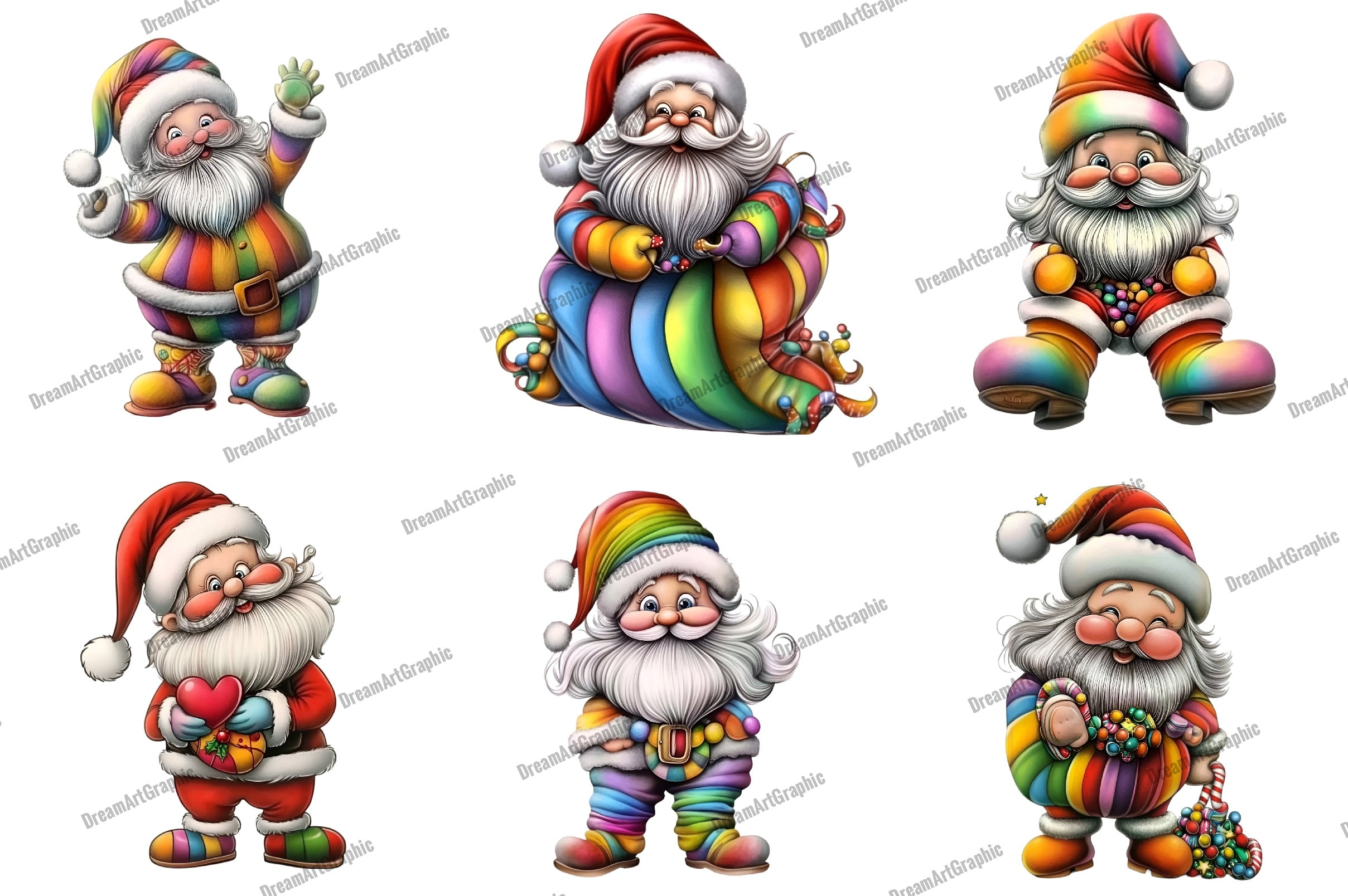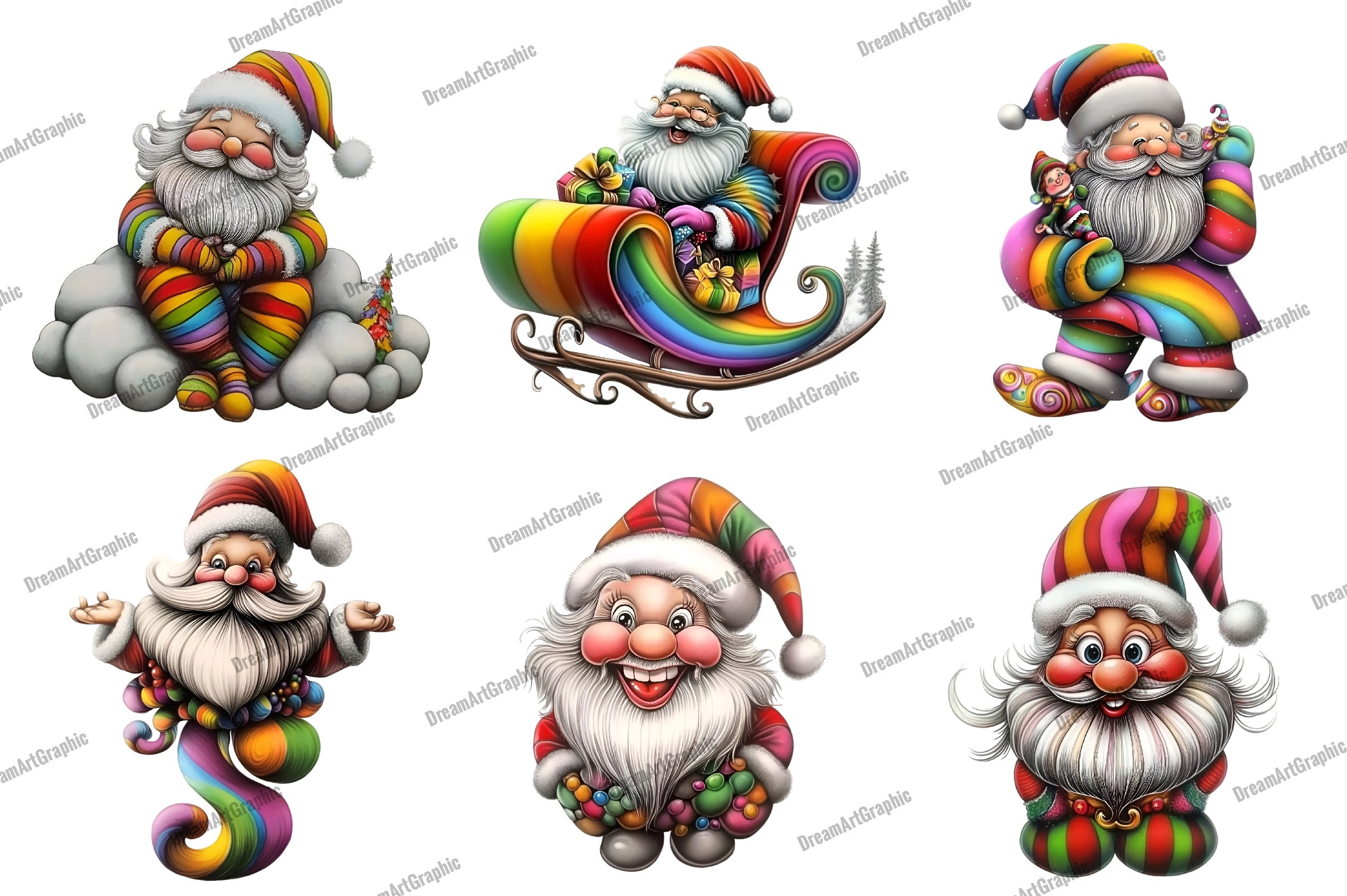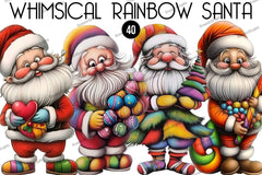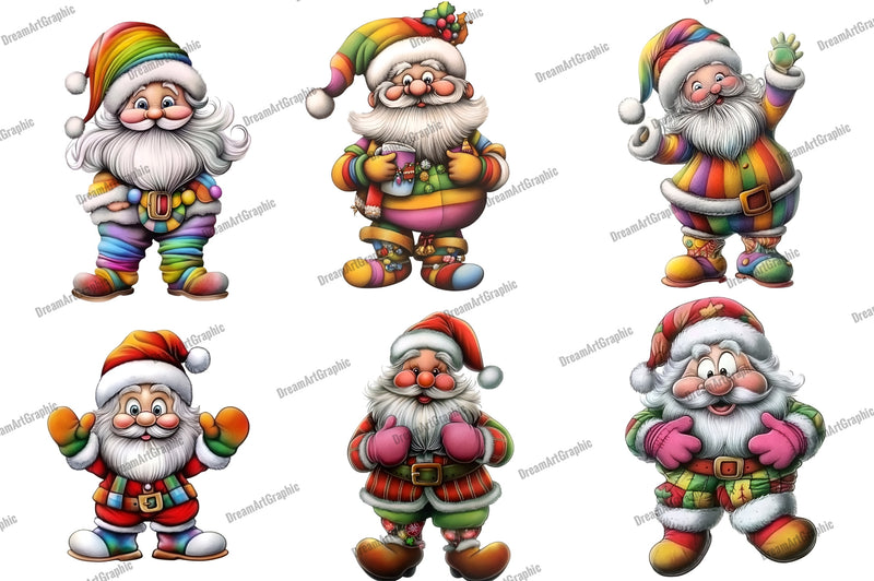Transform your seasonal creations with this enchanting collection of Rainbow Santa illustrations, ideal for personalized gifts, greeting cards, and more.