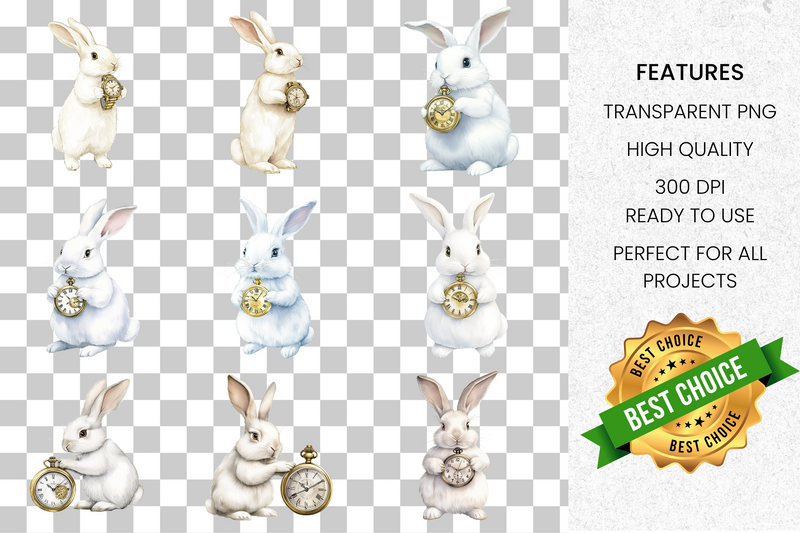 Discover timeless elegance with our White Rabbit Pocket Watch Clipart Bundle, featuring intricate designs perfect for vintage-inspired projects, whimsical invitations, and enchanting scrapbooking. Elevate your creative endeavors with these high-quality illustrations, ideal for adding a touch of classic charm to any digital or print design. Unleash your imagination and captivate your audience with this versatile collection, perfect for both personal and commercial use.